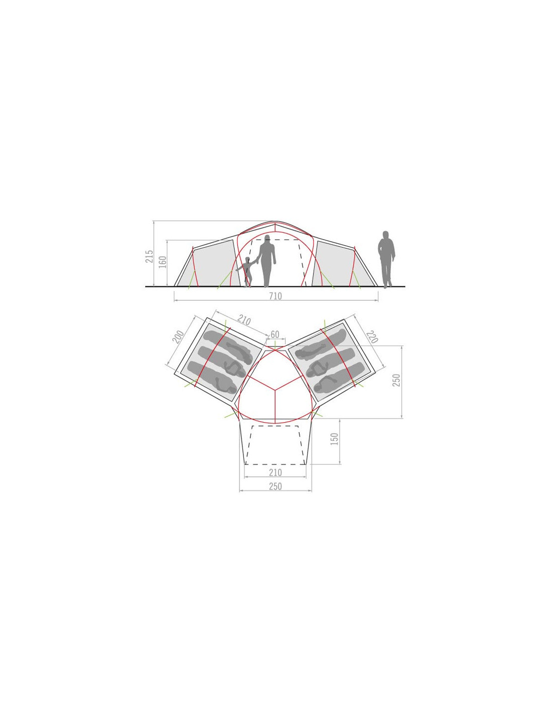 Labai erdvi trijų sezonų palapinė. Jame yra didelė vidinė erdvė, kurioje gali gyventi iki 6 žmonių, po tris vienam kambariui, ir erdvus bendras vestibiulis, kuriame galime susidėti visas savo medžiagas ir net pavalgyti su šeima, jei oras nėra pakankamai geras, kad tai daryti lauke.