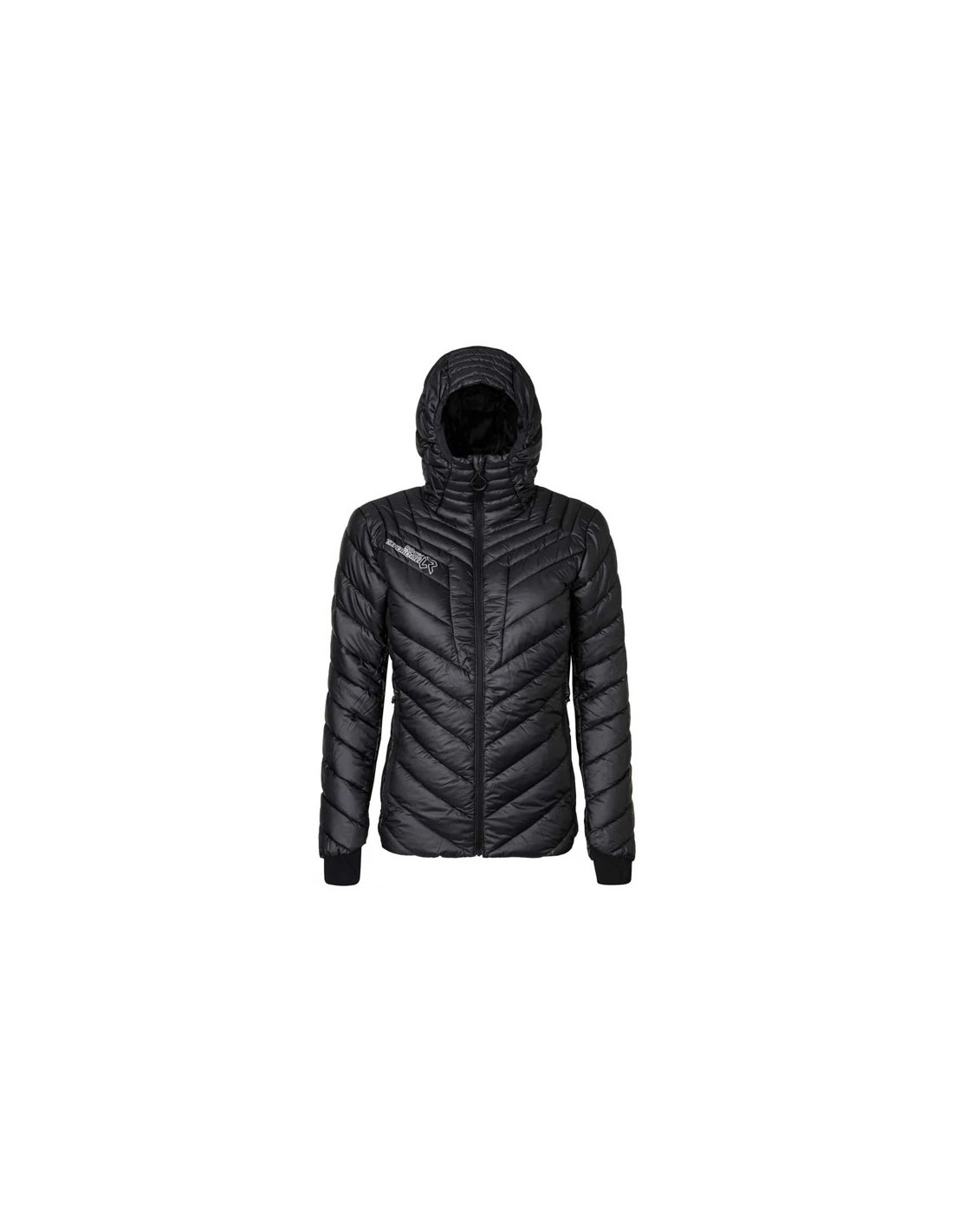 Tkanina zewnętrzna z recyklingowanego poliestru ripstop z powłoką hydrofobową jest odporna na ścieranie i pozwala wodzie i wilgoci spływać, chroniąc wewnętrzne wypełnienie. Podwójne mankiety z Lycry zapewniają wygodne, bezpieczne dopasowanie, a kaptur i dół obszyte Lycrą przylegają do ciała.