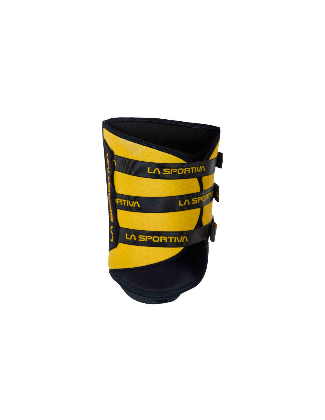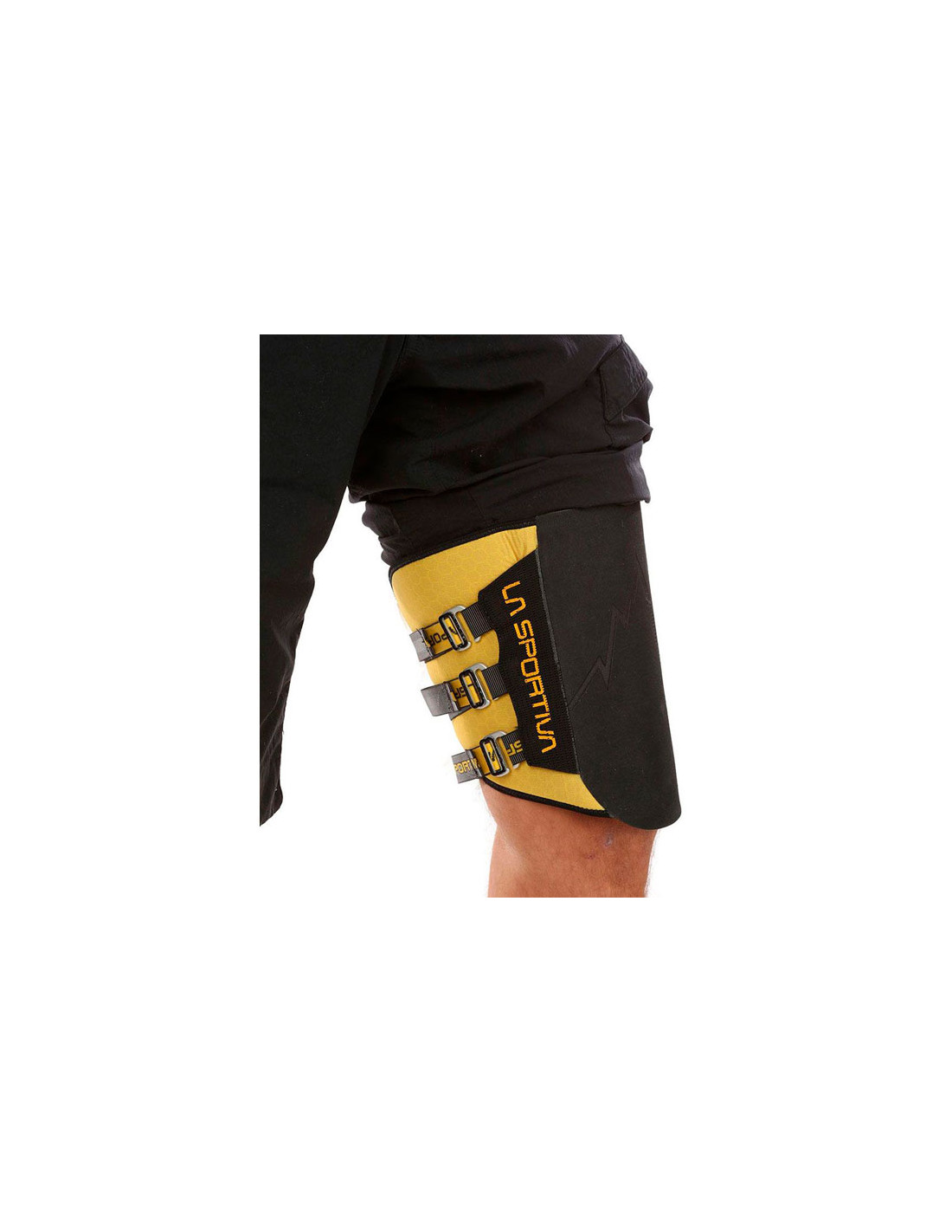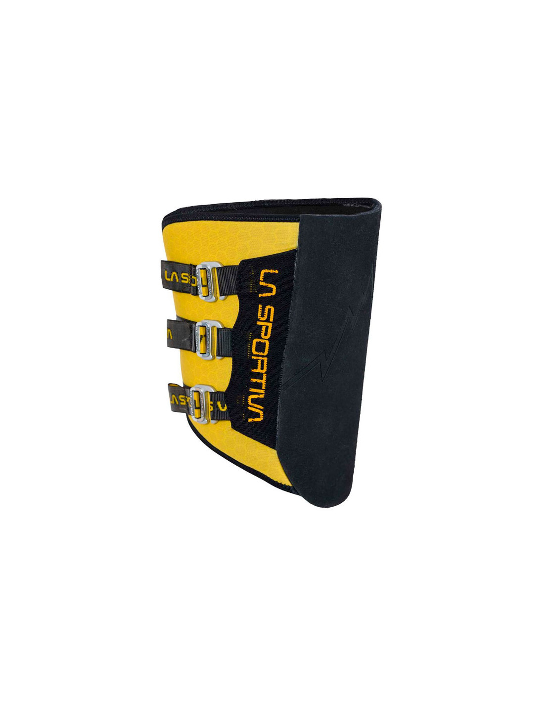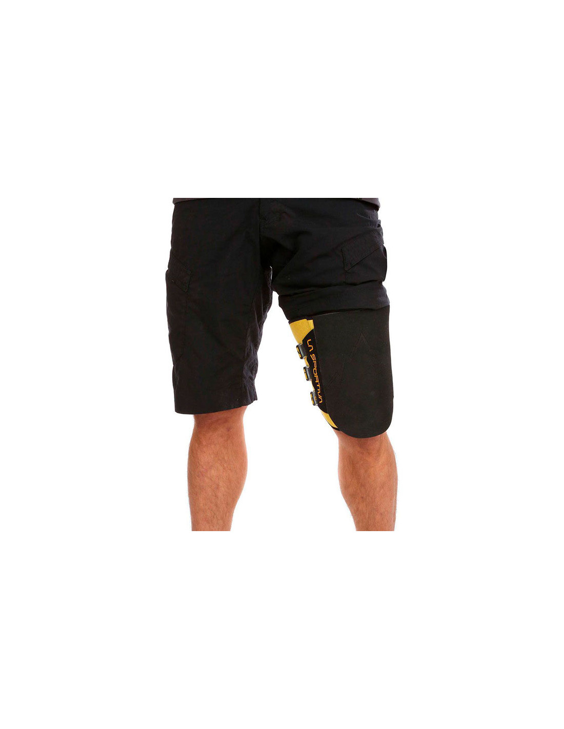 Guma o wysokiej przyczepności 4 mm. na zewnątrz i dwuwarstwowy neopren o grubości 3 mm od wewnątrz, z antypoślizgową powłoką silikonową. Podwójne elastyczne zapięcie na pasek umożliwia szybkie zamocowanie na mięśniu czworogłowym. Pomiędzy wewnętrzną wyściółką a zewnętrzną gumą znajduje się warstwa tworzywa sztucznego, która sprzyja rozkładowi ciśnienia. Grafika La Sportiva wydrukowana laserowo na gumie.