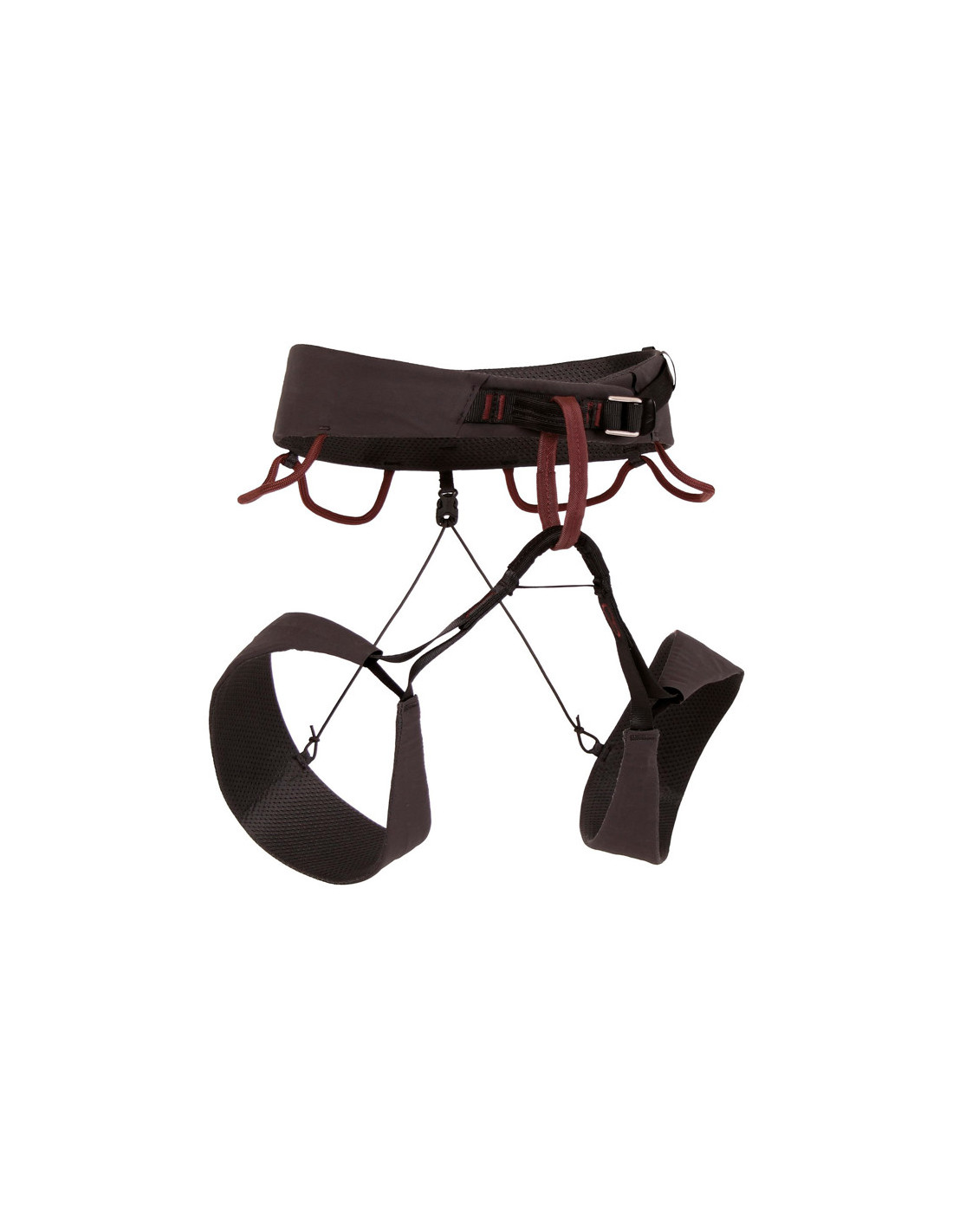 Este arnês destaca-se pelo seu design minimalista e eficiente. Os passadores almofadados e elásticos para as pernas assentam confortavelmente e podem ser ajustados em altura nas costas usando uma tira fina. O cinto, também almofadado, é facilmente ajustado em largura com uma fivela para um ajuste preciso e seguro.
