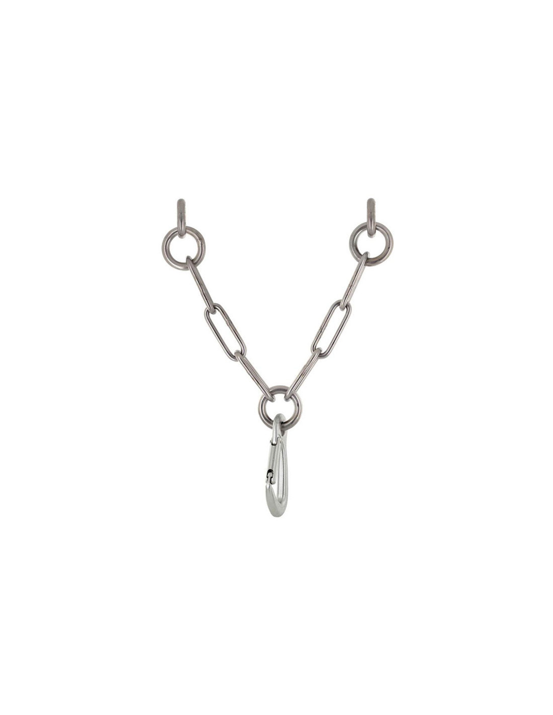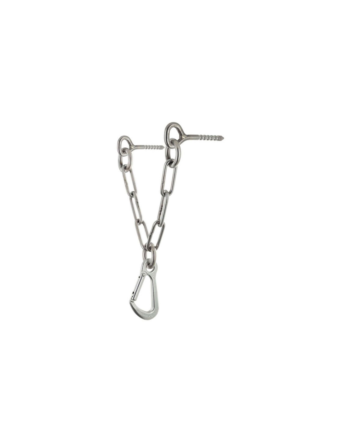 Reunião tipo V em aço inoxidável 316L, para ambientes externos com comprimento útil de 185 mm. Dois pontos de fixação compostos por dois tensores de 90mm. Ponto de ancoragem com mosquetão Draco.