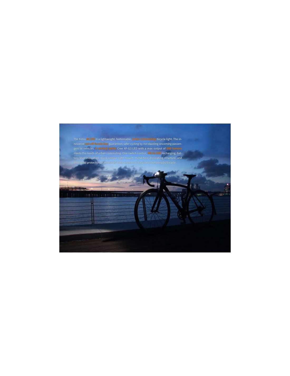A Fenix BC25R é um holofote de bicicleta leve e moderno, ideal para deslocações urbanas e de montanhismo. Com uma potência máxima de 600 lúmenes, este refletor oferece uma excelente iluminação para uma visibilidade ideal. A sua inovadora linha de corte de luz evita encandear os peões e os veículos que se aproximam, garantindo uma maior segurança durante a condução.