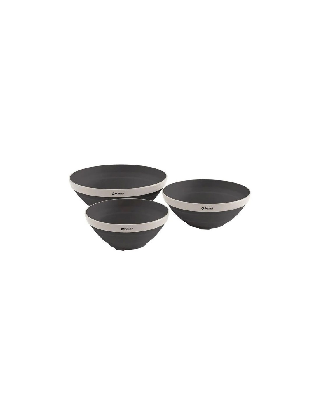 - Três tamanhos de tigelas dobráveis que podem ser armazenadas uma dentro da outra.