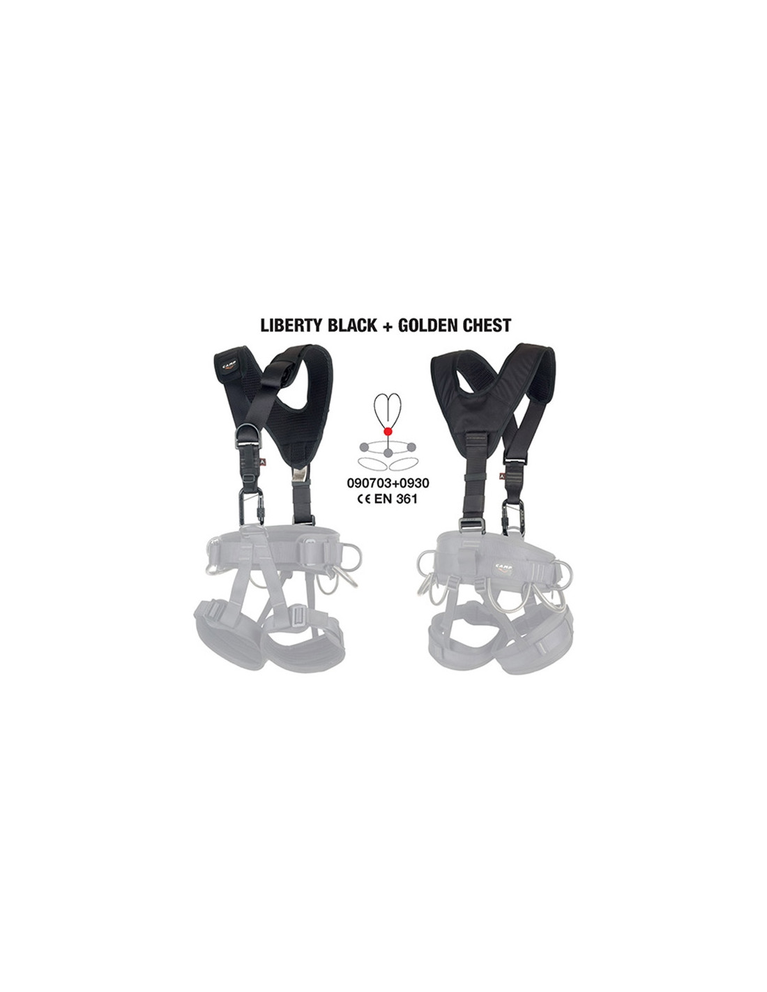 Prsni pas Golden Chest znamke z oblazinjenimi ramenskimi blazinicami, ki jih je mogoče kombinirati z pasom Liberty. Opremljen je s sternalno točko proti padcu.
