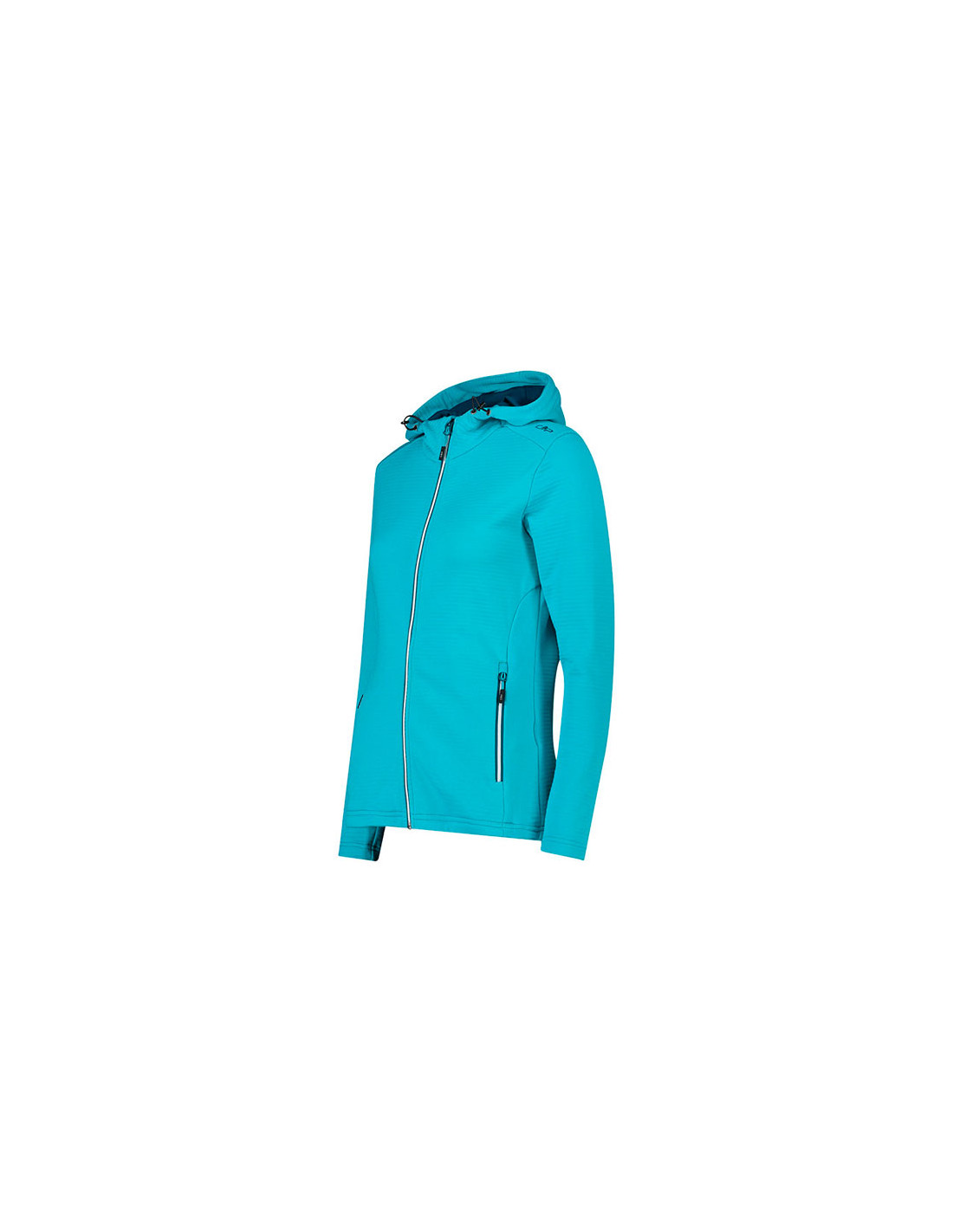 Dámsky fleece s kapucňou zo žakárovej tkaniny so špeciálnym tubulárnym spracovaním, ktoré odevu dodáva technický vzhľad.