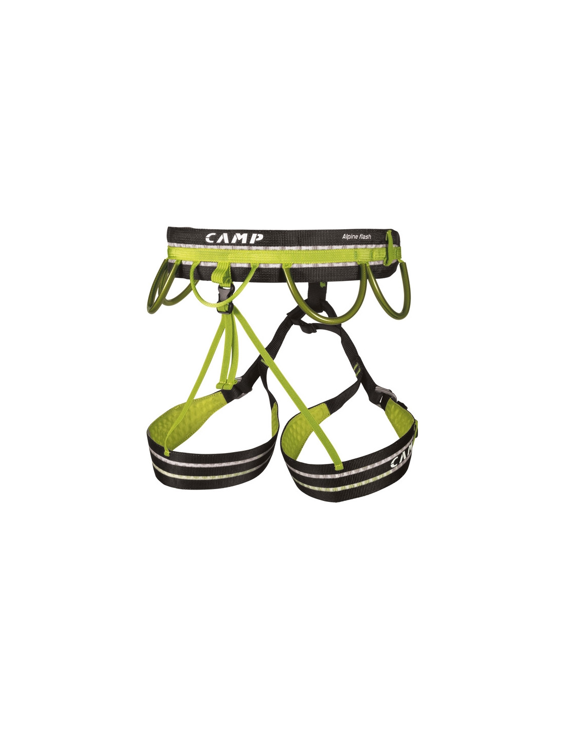 Alpine Flash Alpine Flash špeciálne pre horolezectvo dopĺňa sériu inovatívnych superľahkých úväzkov CAMP s kónickým popruhom. Alpine Flash odvodený od úväzku Flash na športové lezenie sa odlišuje nastaviteľnými a odnímateľnými nohavičkami s rýchlym uzáverom (možno použiť aj v rukaviciach), pútkami na výstroj prekrytými hadičkou (plus piatou v strede nánožníka). späť) a integrovanými slučkami pre karabíny tímu Hub.