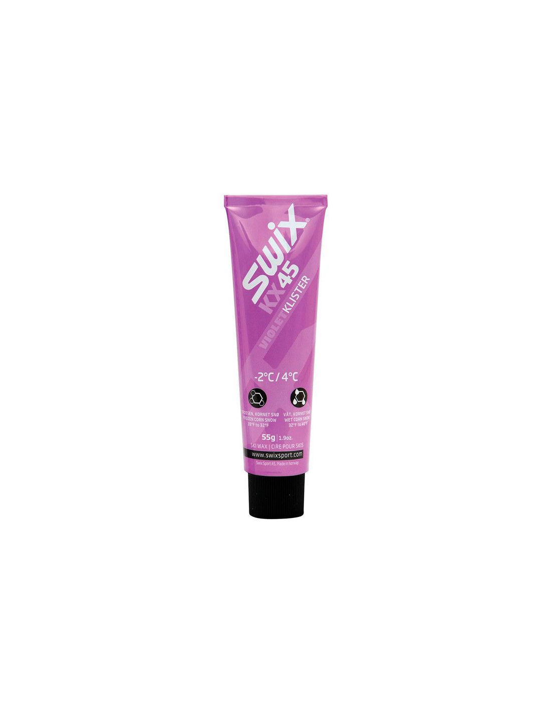 Violet Klister. Teplotný rozsah -2°C až +4°C. Klister so širokým rozsahom použitia na oboch stranách nula stupňov. Na mokrý aj zamrznutý hustý sneh. Vrátane plastovej škrabky.