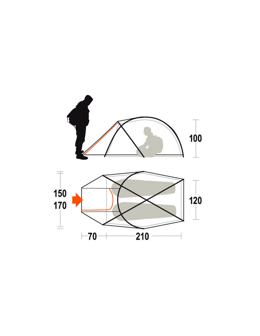 Den har en roll-up främre vestibul, en sovrumsdörr med ett utvändigt myggnät som öppnas helt och förvaras i en speciell ficka, och ventilationsöppningar som kan stängas från insidan.