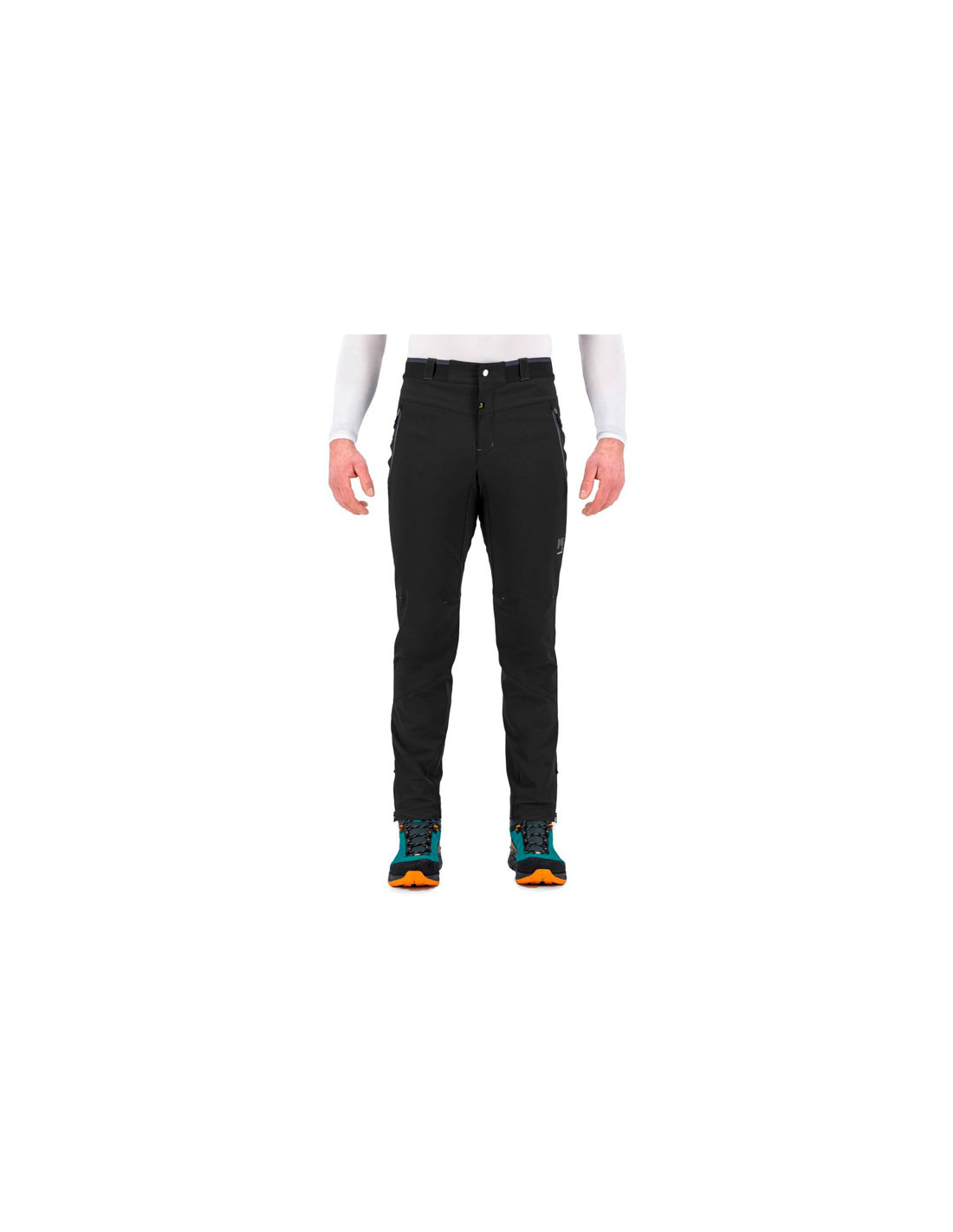 Tillverkad med två kammade bi-elastiska tyger för att garantera utmärkt värme och andningsförmåga. Elastisk midja med bälteshällor, knapp och hak-och-ögon-stängning fram. Dess design inkluderar två blixtlåsfickor på framsidan och en på baksidan. I ankelområdet har den en dragkedja med kil.