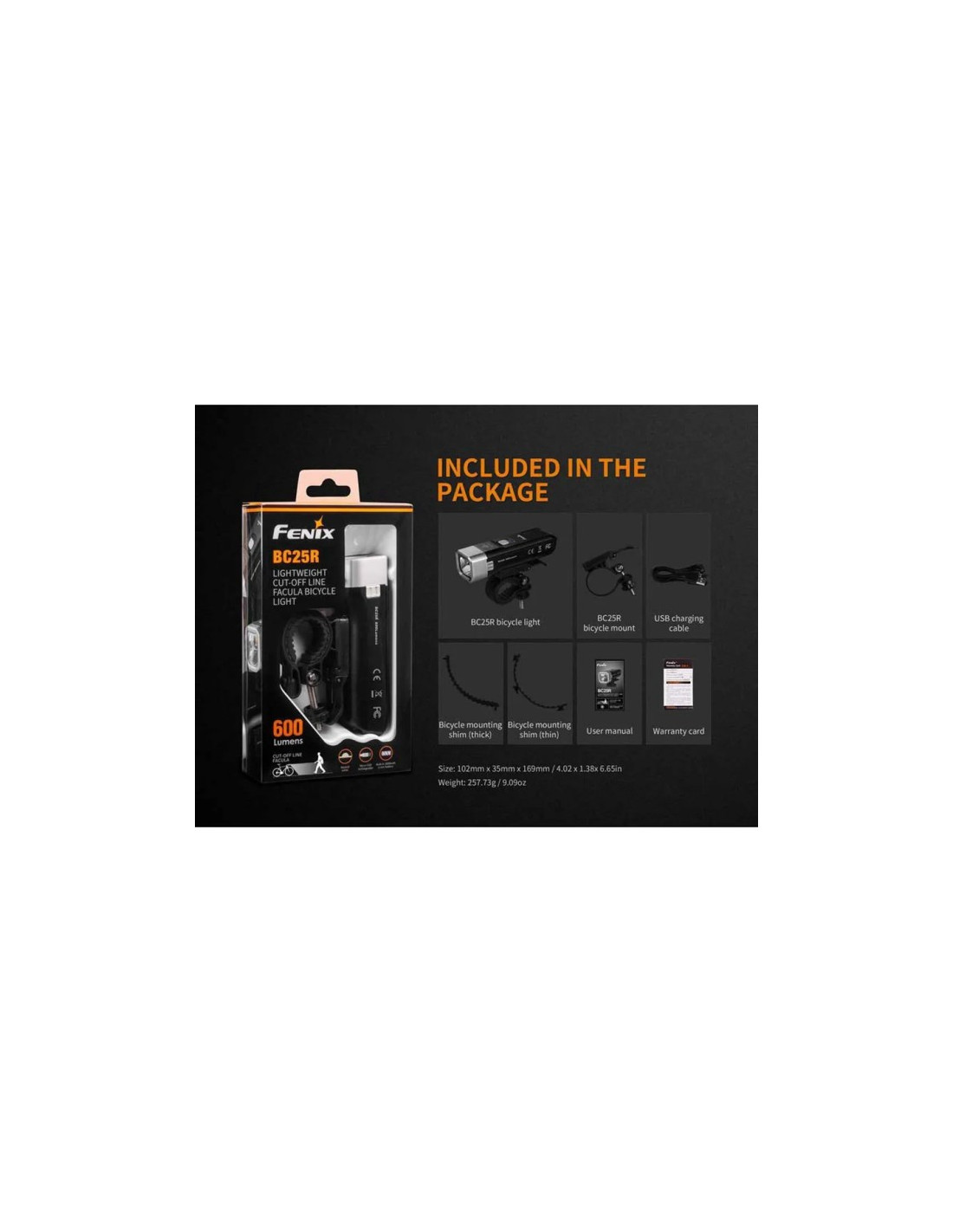 Fenix BC25R är en lätt och modern cykelspotlight, idealisk för pendling till och med bergsklättring. Med en maximal effekt på 600 lumen erbjuder denna spotlight utmärkt belysning för optimal synlighet. Den innovativa ljusavbländningslinjen undviker att blända fotgängare och mötande fordon, vilket ger större säkerhet under körning.