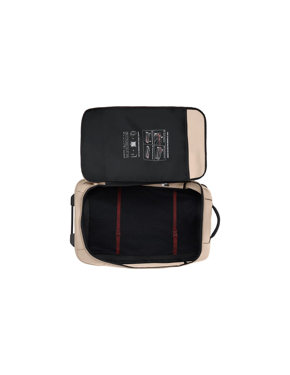 - Falskt nätgolv med dragkedja och remmar för att organisera bagaget.