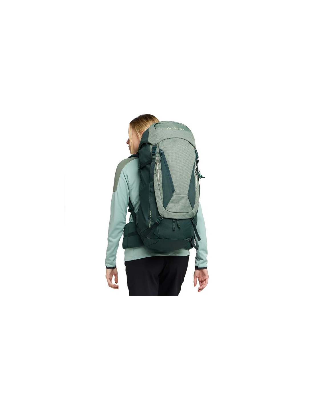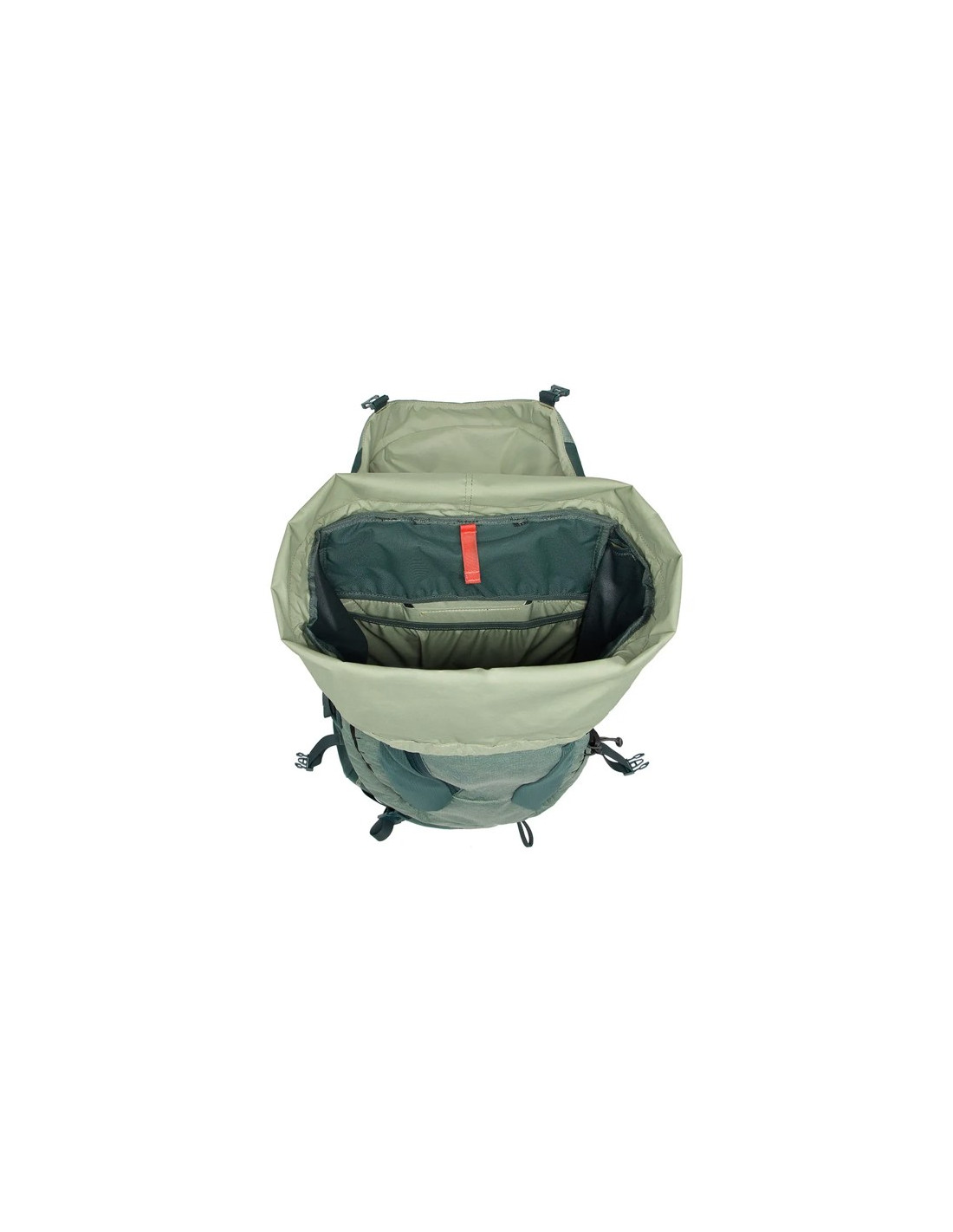 Asymmetric 38+8 har två kompressionsremmar på varje sida och en under locket, med ett integrerat reservspänne. Det höjdjusterbara locket ger upp till 8 liter extra volym. Detta paket är huvudsakligen tillverkat av återvunnet material och återspeglar ett engagemang för hållbarhet.