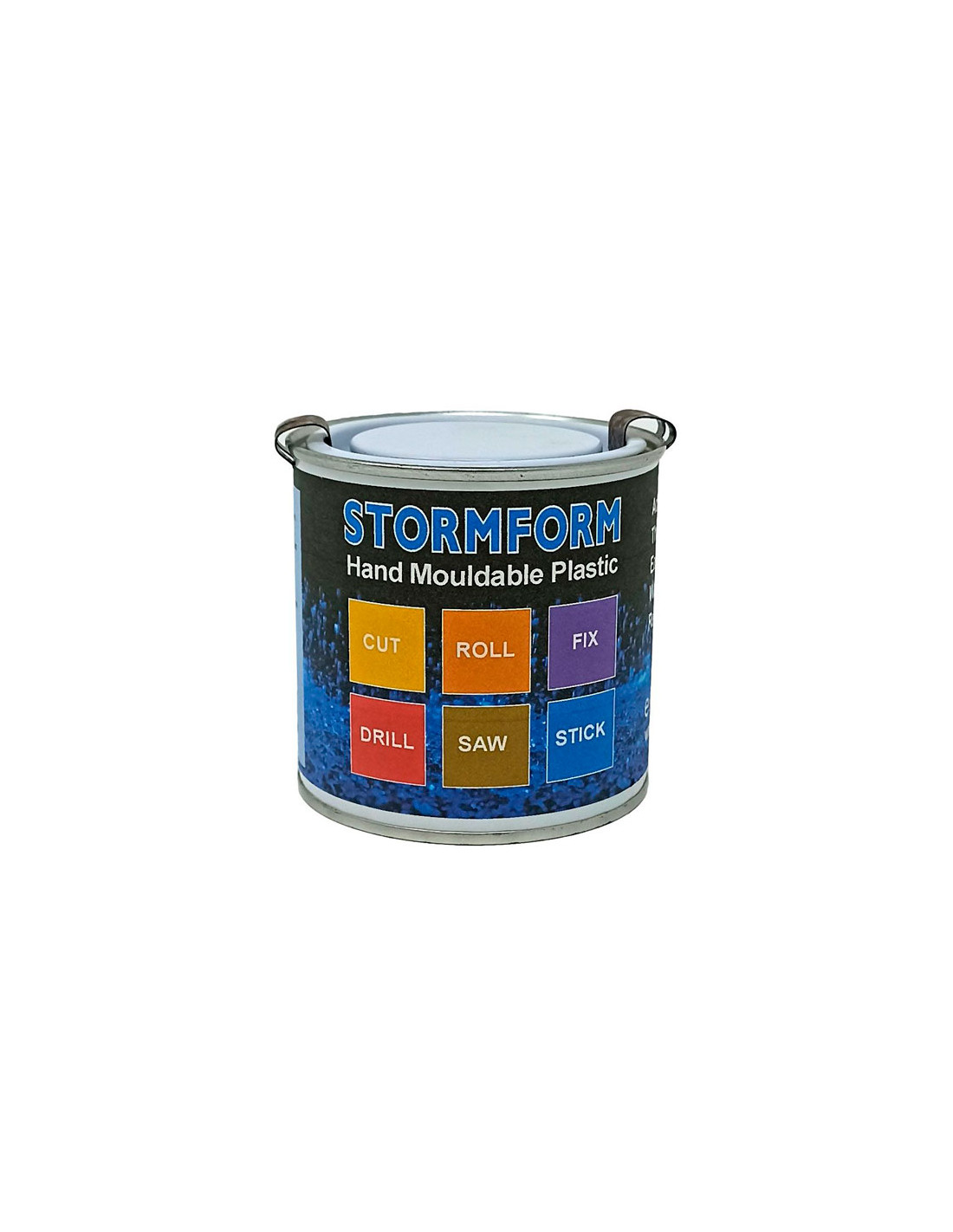 Ett paket som innehåller 250 ml vita Stormform granulat. Lägg granulatet i en kopp och tillsätt kokande vatten, de smälter och blir genomskinliga. Ta bort från det varma vattnet och du kan forma den flytande plasten till vilken form du vill med händerna.